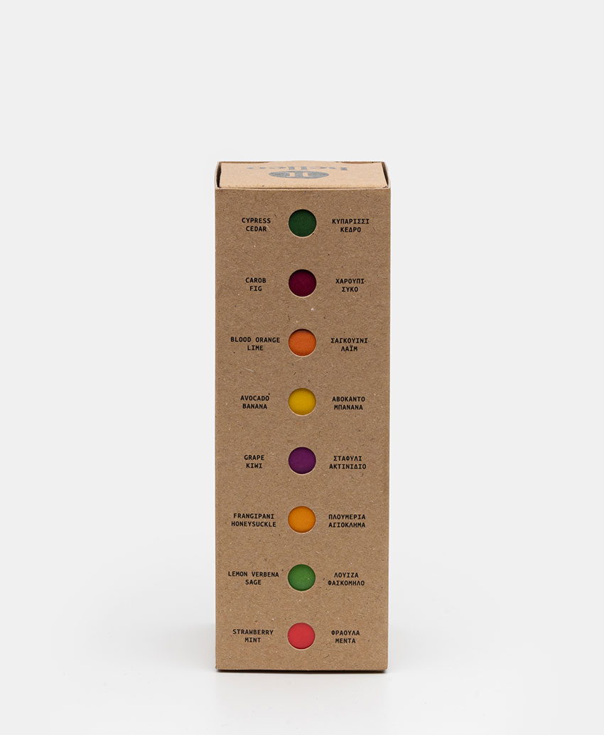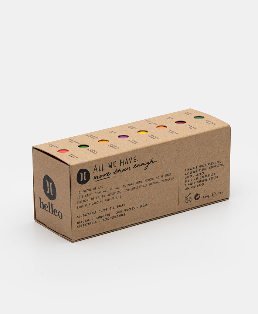 Ολόκληρη η σειρά των 8 φυσικών σαπουνιών helleo σε mini μεγέθη των 30gr, έρχεται συσκευασμένη σε ένα κομψό χάρτινο κουτί για να τα μυρίσετε και να τα δοκιμάσετε όλα ή να τα προσφέρετε ως δώρο.